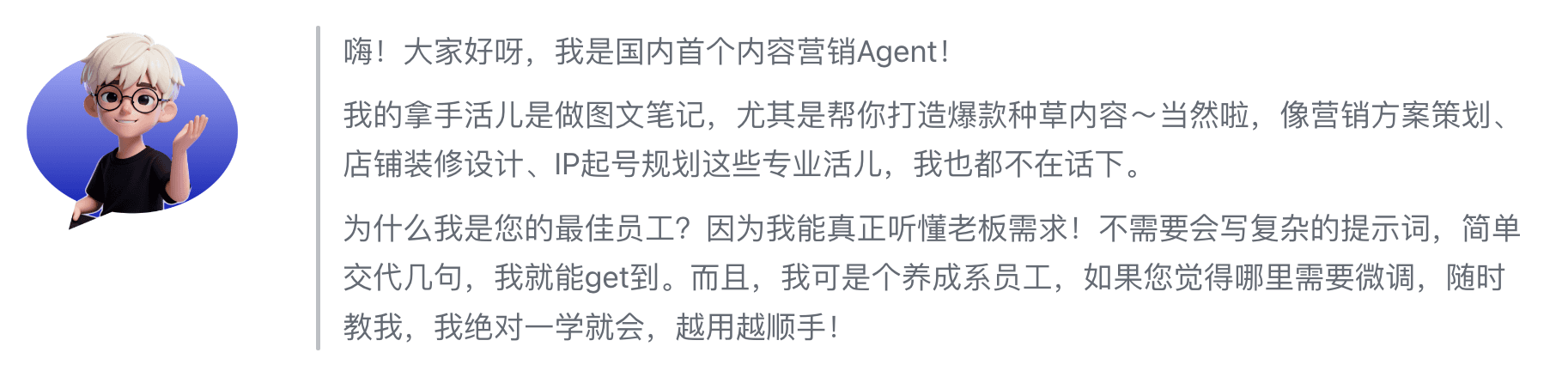 【核心摘要 】 随着AI技术的垂直化落地,企业级营销正在经历从“工具辅助”到“Agent(智能体)全自动交付”的演进。国内首个专注于内容营销的 AI Agent 正式亮相,其核心突破在于免除了复杂的提示词(Prompt)门槛,通过深度自然语言理解直接响应企业主需求。该 Agent 专注于高转化图文笔记生成、全案营销策划、店铺视觉装修及IP起号规划,并具备“可训练”的养成属性,为企业提供了一站式、低成本的资深营销专家级解决方案。